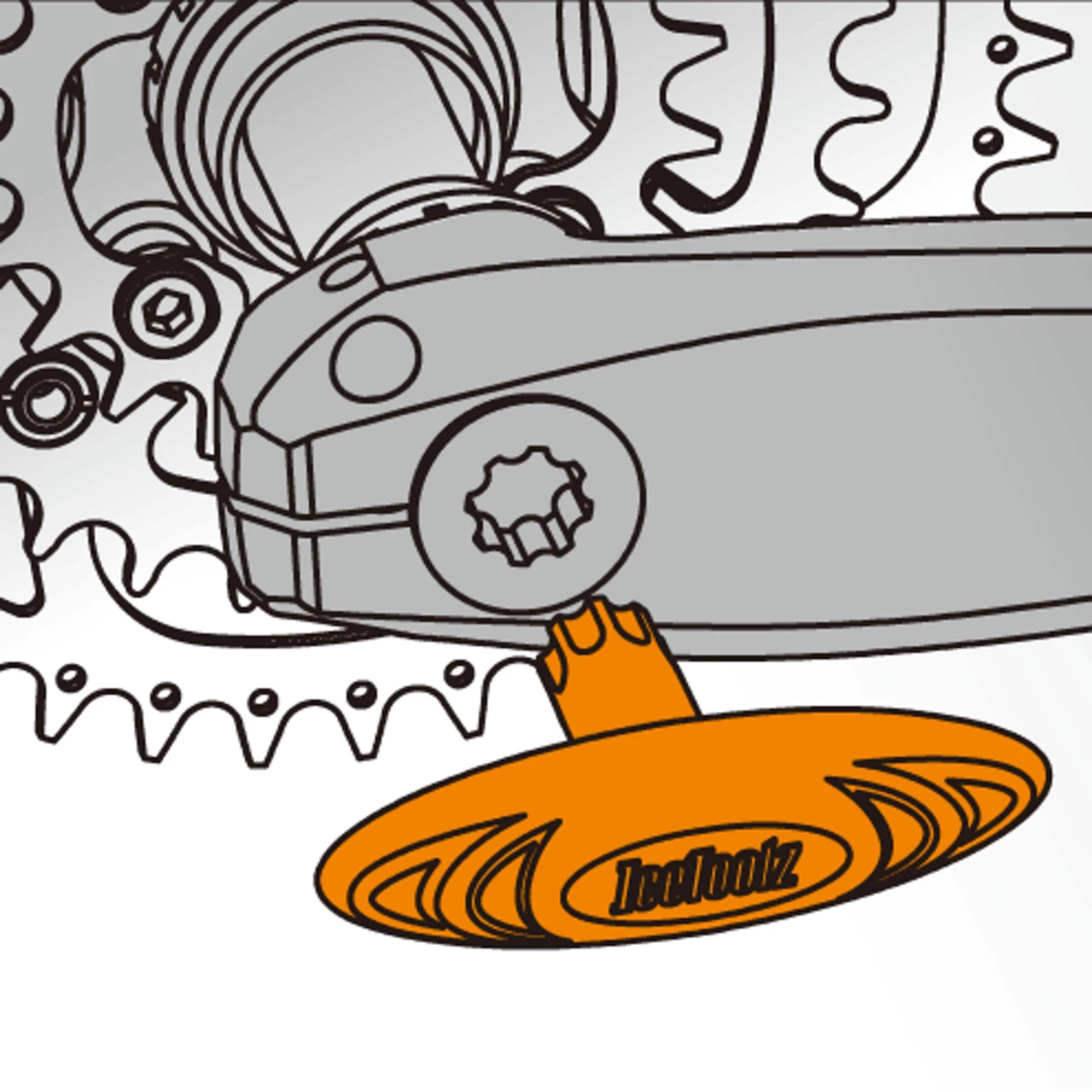 L’outil démonte pédalier IceToolz tient agréablement en mains, desserre et resserre facilement les vis de fixation du pédalier p. ex. sur la manivelle gauche du Shimano Hollowtech II. L’outil ergonomique pour manivelles est une clé vraiment solide, bien qu’il ne soit pas fait en acier.