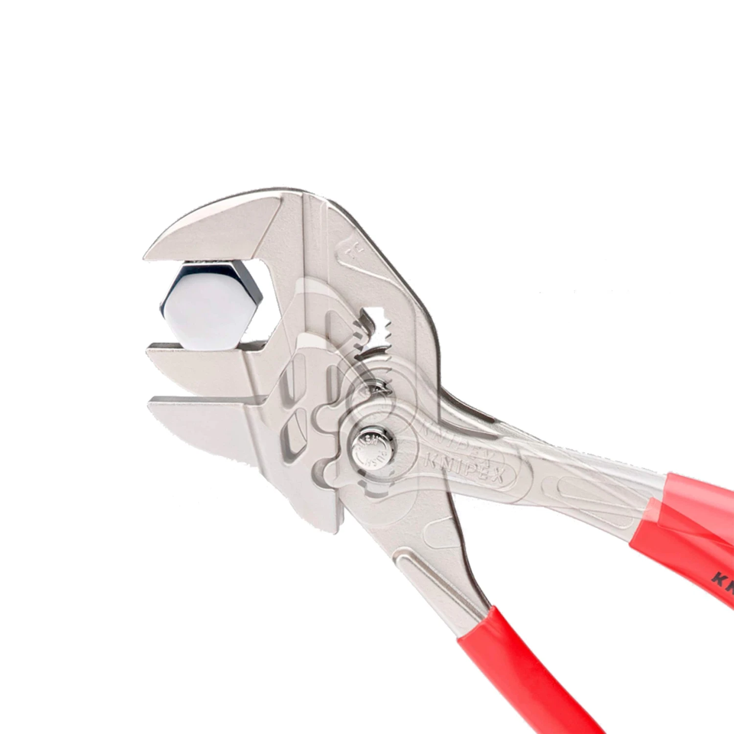 Pince et clé en un! La pince-clé Knipex remplace le jeu de clés plates complet jusqu’en 46 mm et s’utilise même comme pince. Après avoir réglé l’ouverture de la clé en un clic sur la vis en question, vous serrez la vis hexagonale très facile et confortablement. La course entre les surfaces de contact mène à agréablement exécuter les tâches d’après le principe d’une crémaillère, sans qu’il soit nécessaire de retirer la pince.