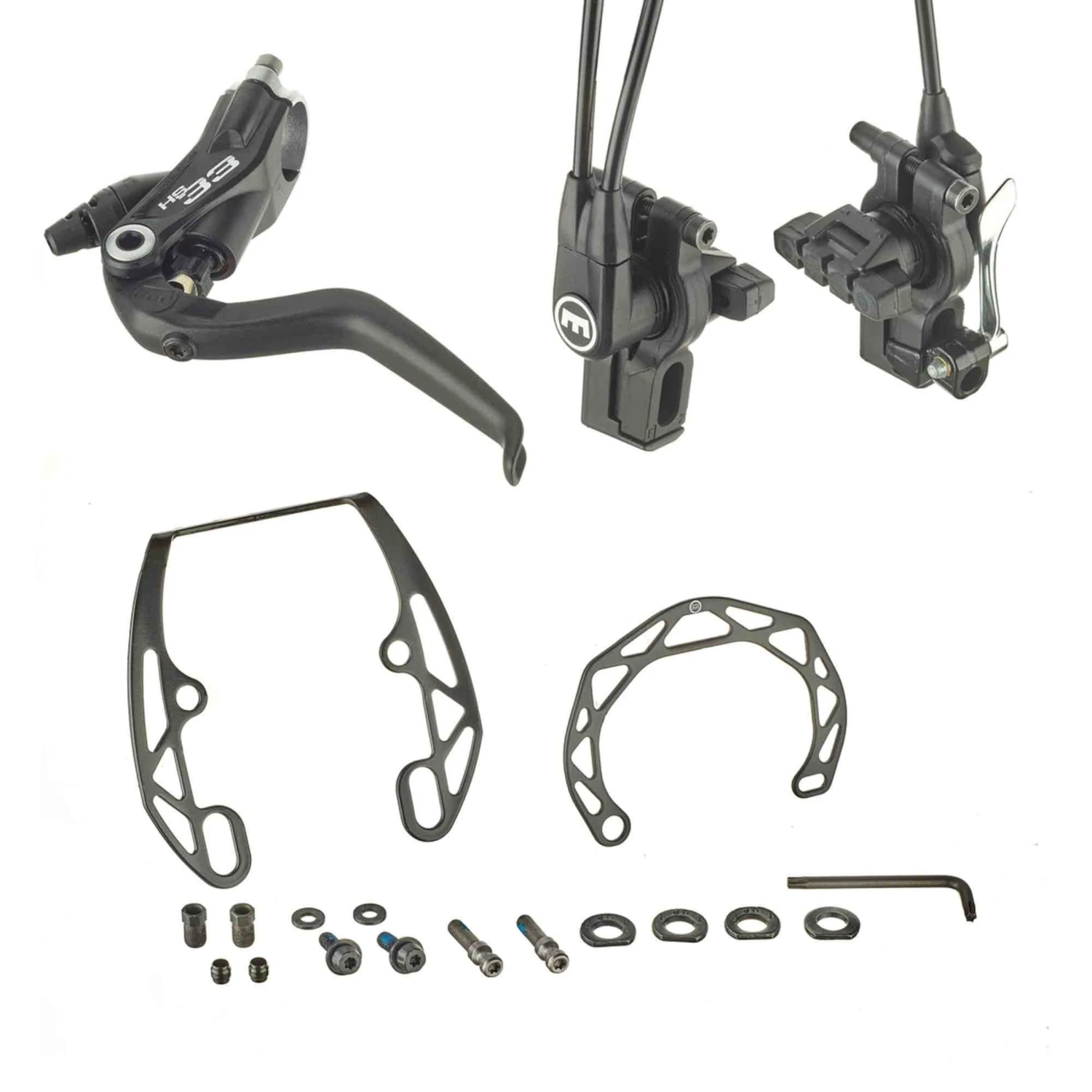 Livraison comprend : 1 frein pour la roue avant ou la roue arrière, longueur de la conduite : 2 000 (raccourcissable), rempli et purgé prêt pour le montage, avec serrage rapide, patins de frein noirs, vis de fixation, plaque de montage et brakebooster EVO 2