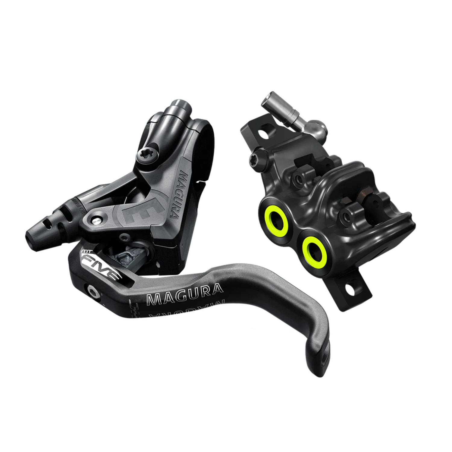 Neben neon-gelben Blendenringen am Bremssattel ist der montierte 1-Finger HC Bremshebel ein Erkennungszeichen für das MT5 PRO Scheibenbremsen-Set mit Storm HC Bremsscheiben.