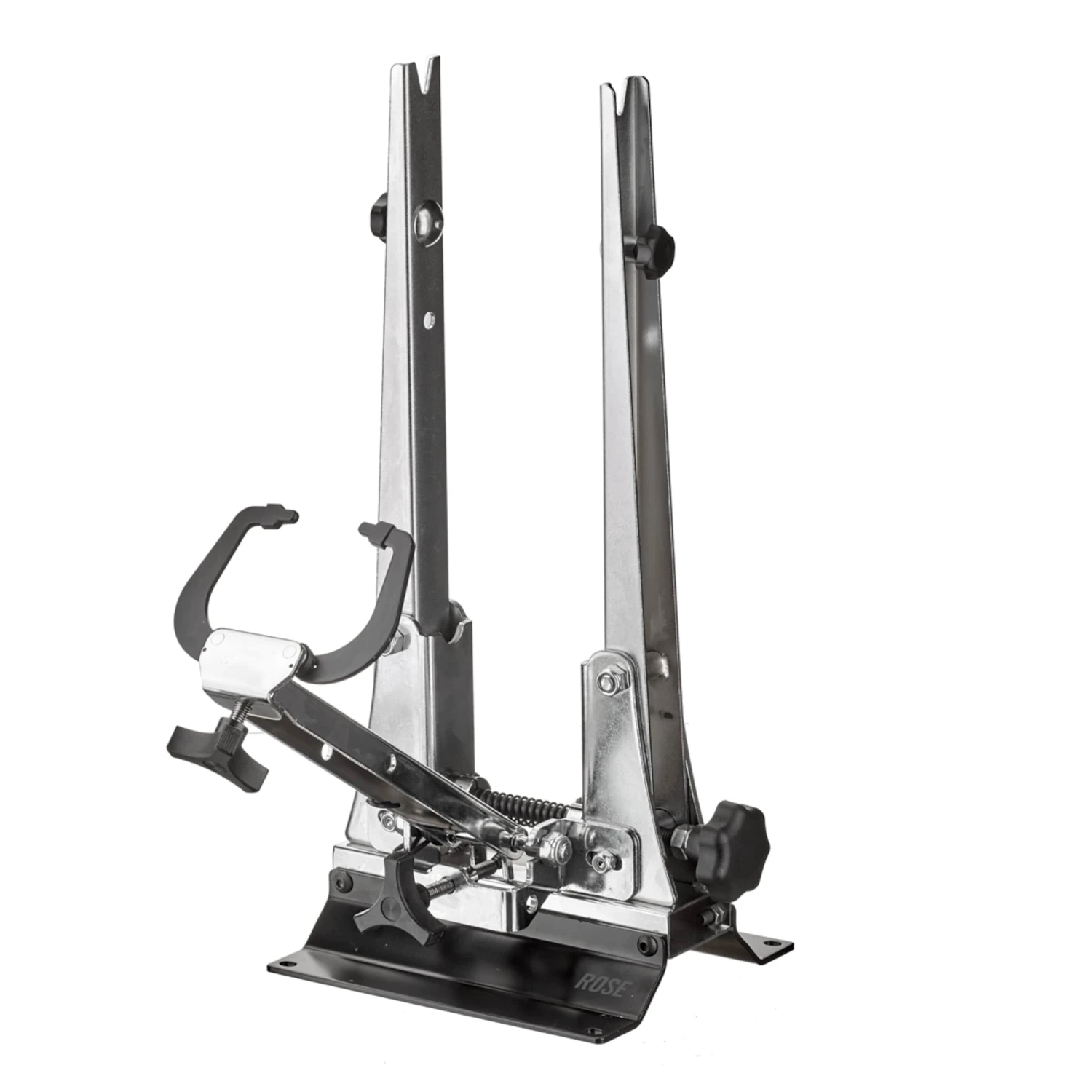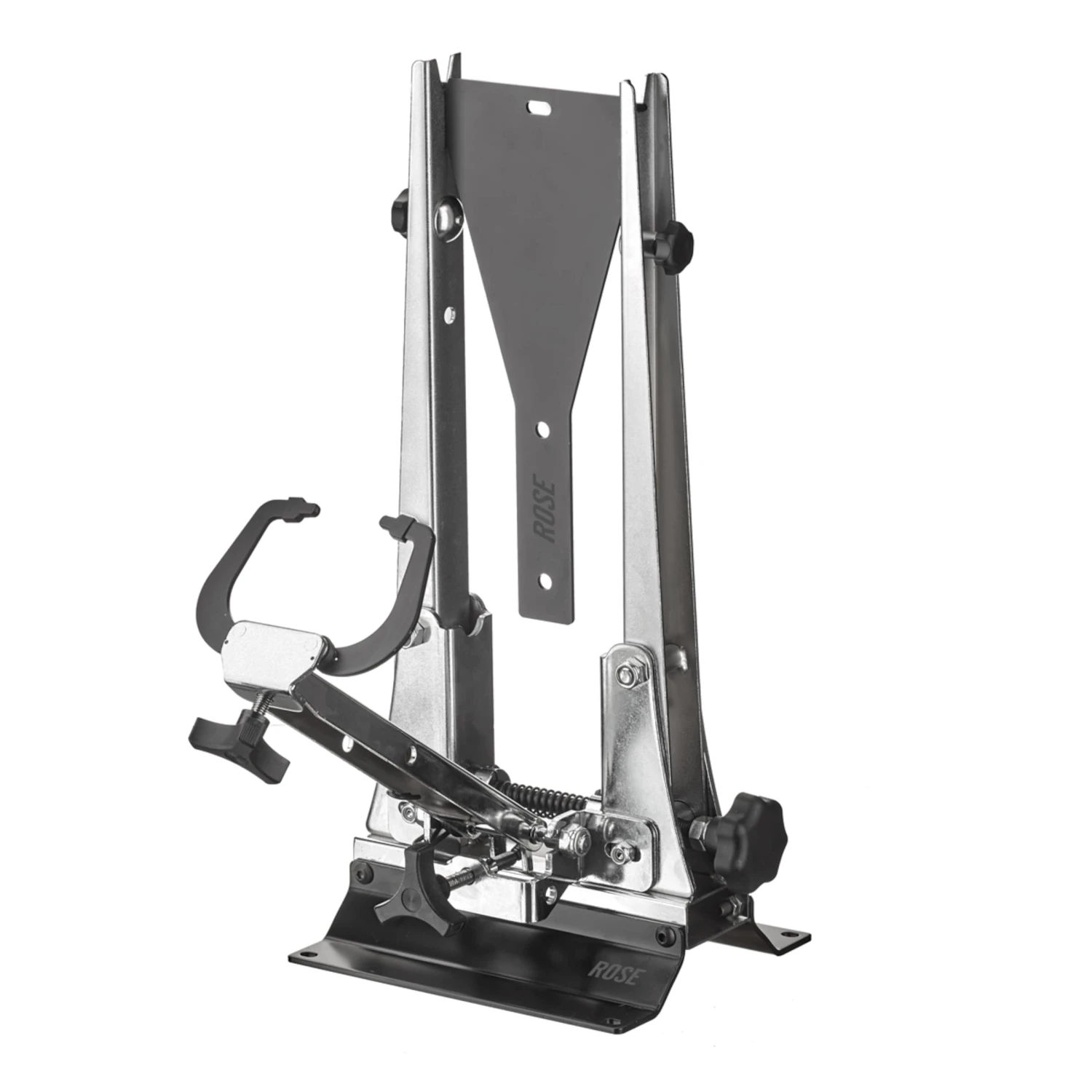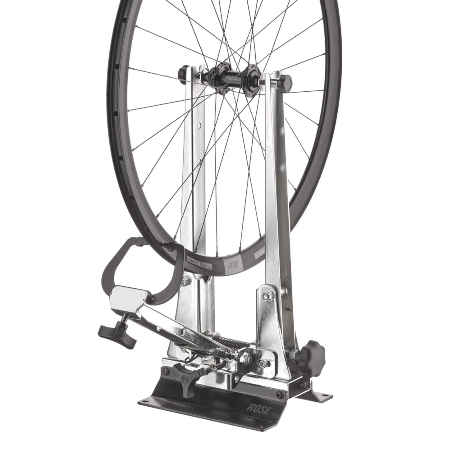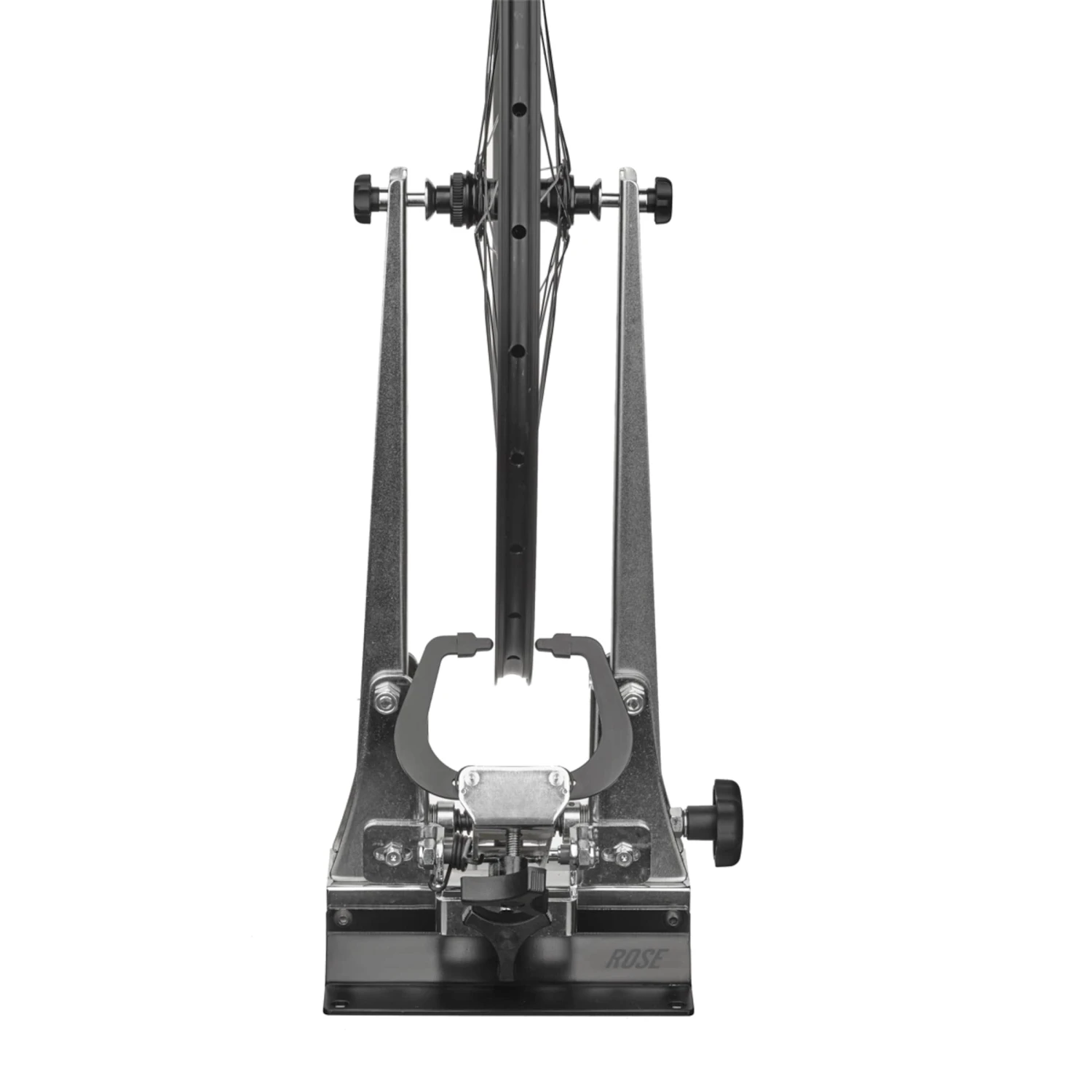 Il y a des molettes ergonomiques pour serrer le moyeu ou ajuster les bras de centrage et les flèches que l’on peut adapter avec précision. C’est rapide, précis et sûr pour avoir une roue parfaitement centrée. Vu sa construction massive, le support de centrage ROSE est conçu pour une utilisation fréquente dans l’atelier de tout mécanicien de vélos exigeant. Vu son poids élevé, le 2-Zent.A:-Pro Plus est stable et sûr sur votre atelier. On devrait, dans l’idéal, visser le pied à l’établi pour être bien fixe.