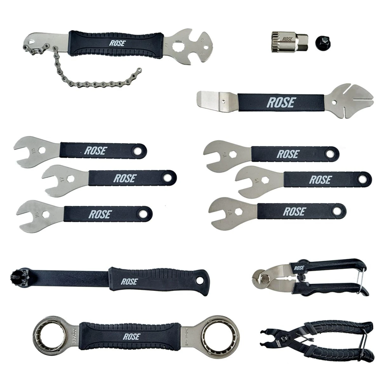 Les bikeurs ambitieux et bricoleurs amateurs en possession de la boîte à outils ROSE ALL2GETHER Performance XL sont préparés pour tout, ou presque. Un choix soigneux des outils de qualité qui conviennent pour des réparations et tâches d’entretien importantes sur des vélos de route, vélos tous terrains et vélos de cyclotourisme modernes, ne laisse quasiment rien à désirer. Adaptée aux montages et mesures courants à nos jours, la boîte de réparation dispose d’une large gamme d’outils spéciaux pour la plupart des tâches sur votre vélo.