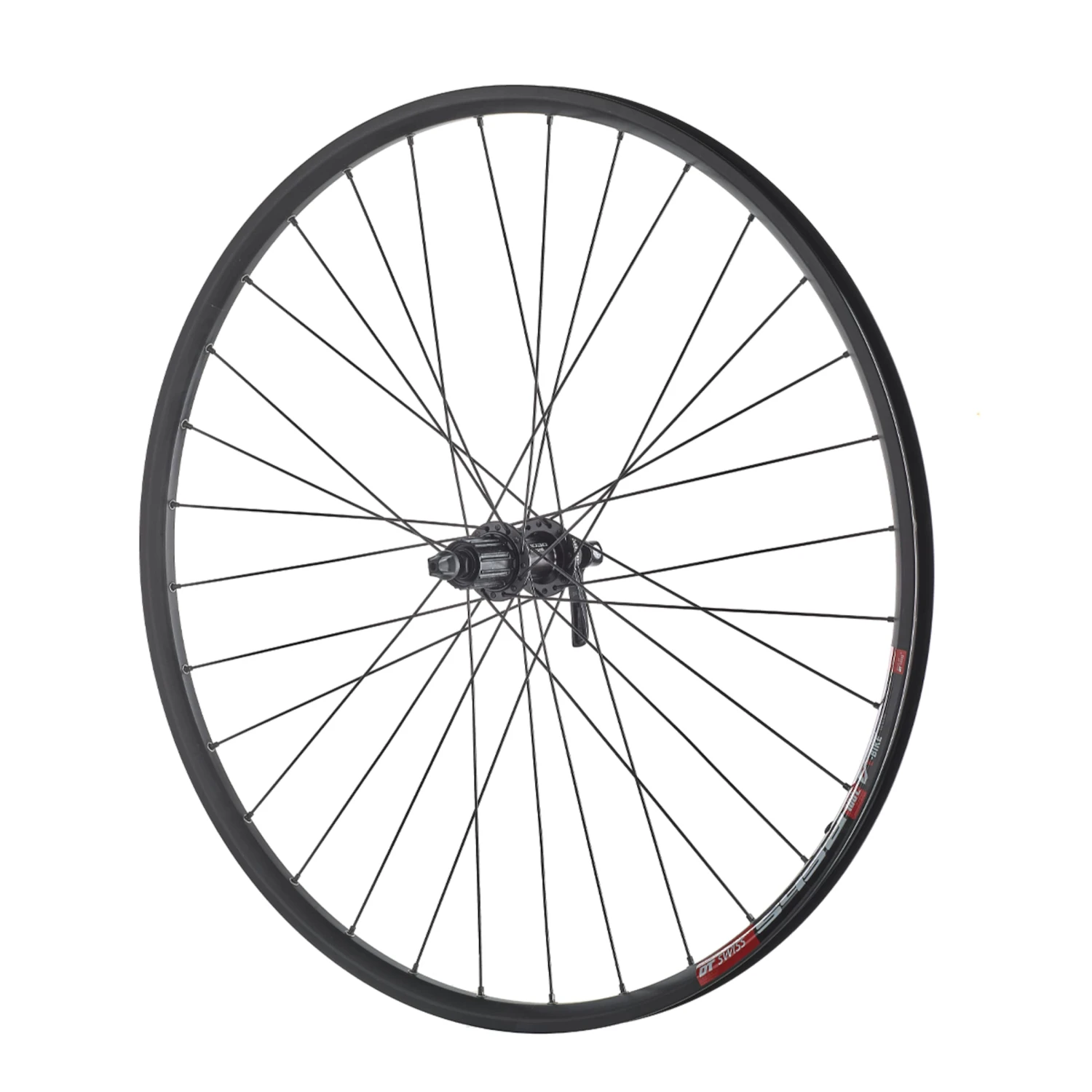 Roue arrière stable avec moyeu de roue libre Shimano Deore, pour tous les vélos de cyclotourisme et de ville usuels qui correspondent aux caractéristiques techniques.