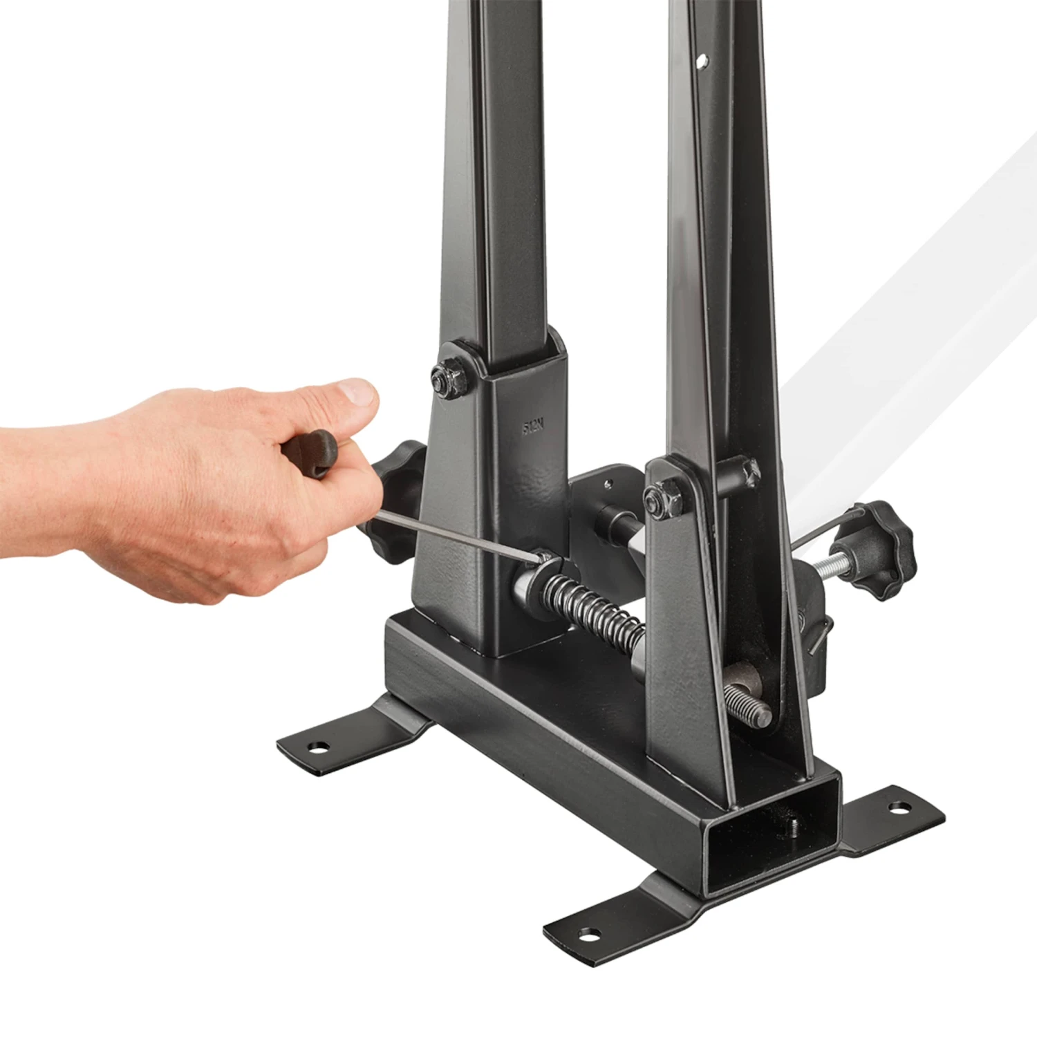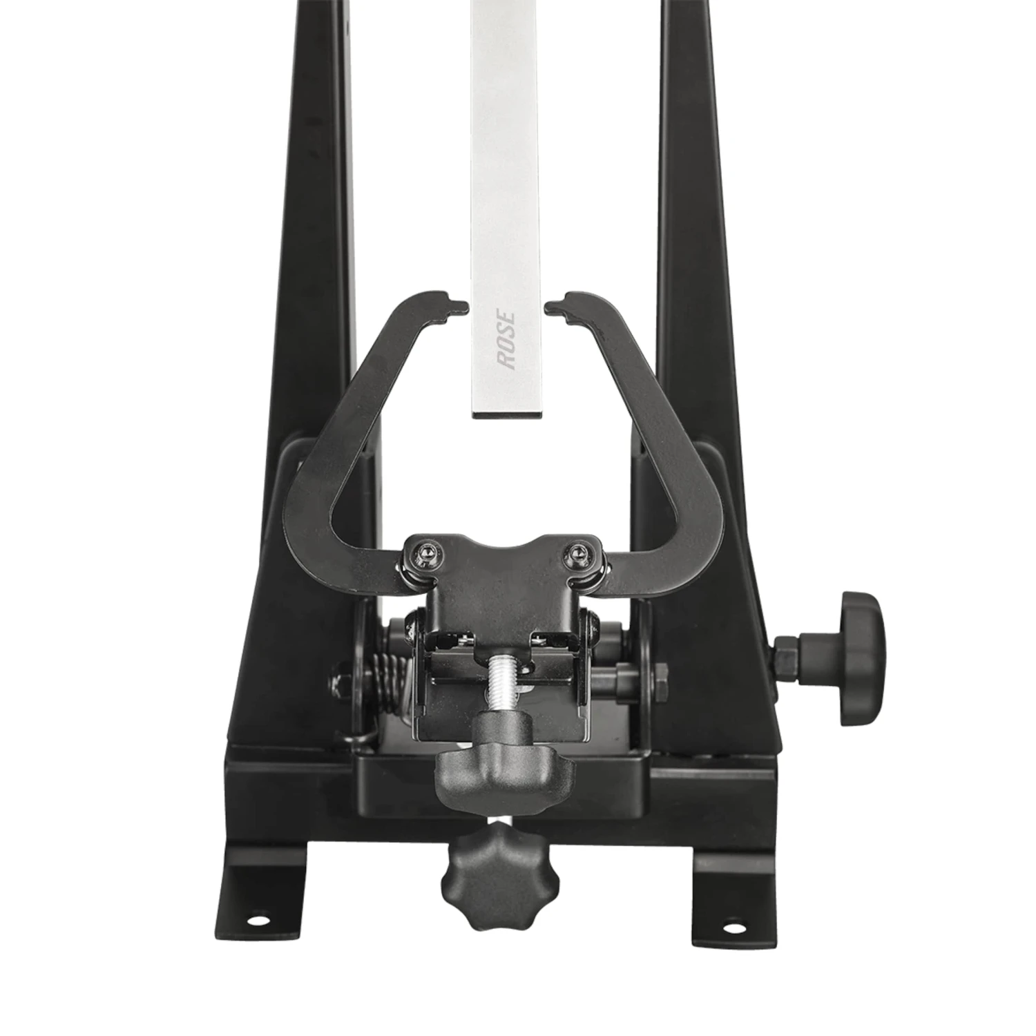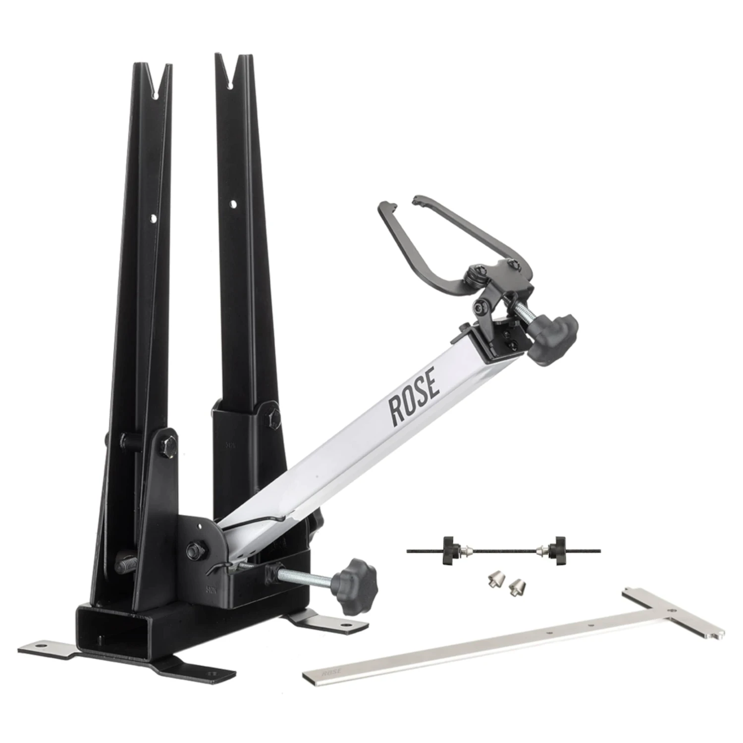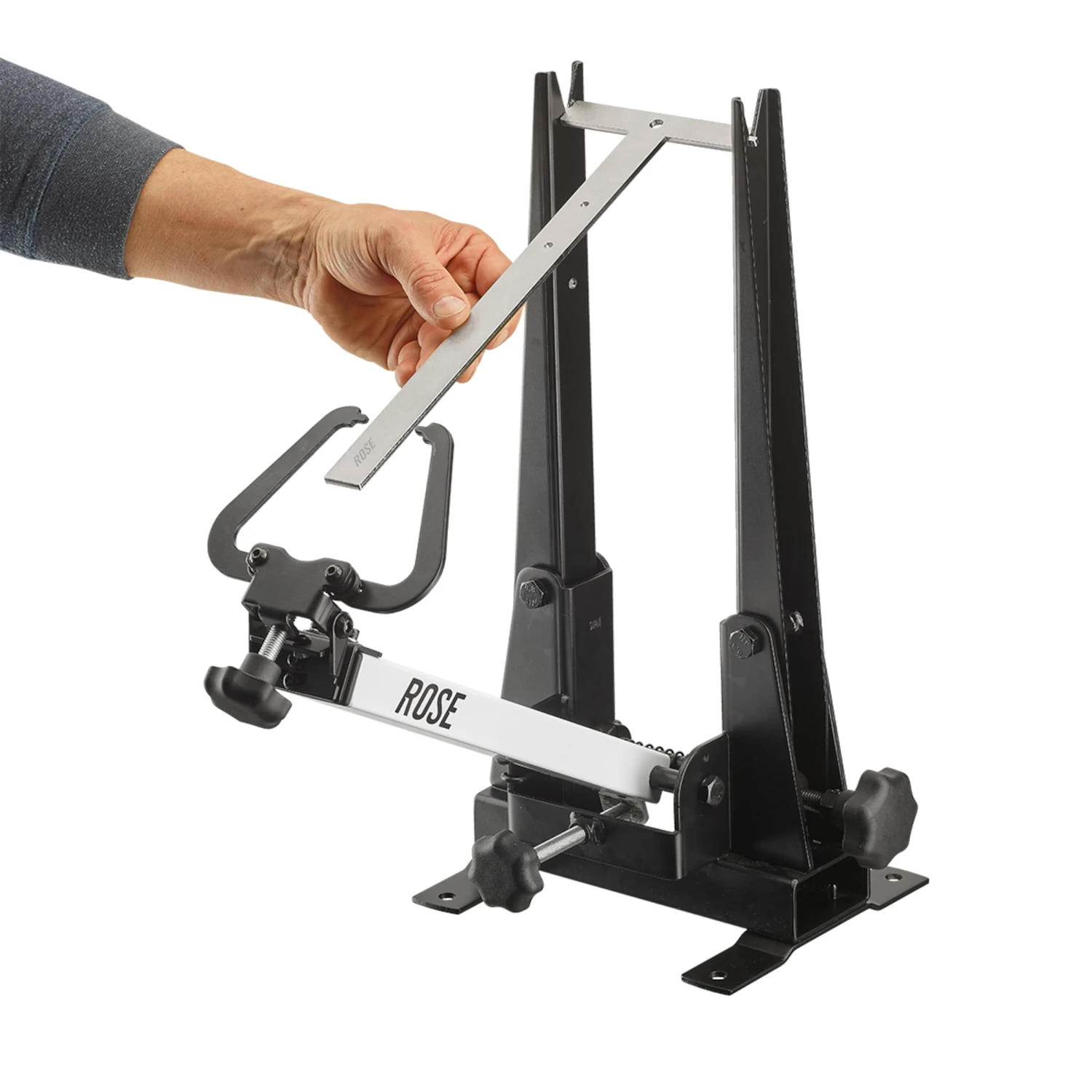 En plus, avec le gabarit de centrage fourni, le bon instrument est à votre disposition pour vérifier l’alignement parfait du pied de dévoilage. Le gabarit de centrage T-Gauge est un auxiliaire pratique pour le centrage avec le pied de dévoilage ROSE 2-Zent.A:-XL, mais il peut également être utilisé ensemble avec d’autres modèles compatibles. Pour contrôler l’alignement parallèle au milieu des bras de centrage avec les palpeurs de centrage de la jante, le gabarit en T de ROSE est mis en place dans le support de roue du pied de centrage. Il est maintenant possible de précisément vérifier l’alignement central ou de parfaitement l’ajuster aux distances identiques sur le pied de dévoilage afin d’orienter la roue au mieux avant centrage.