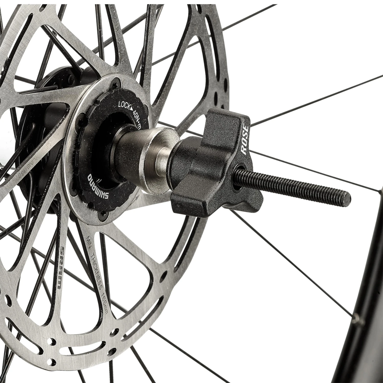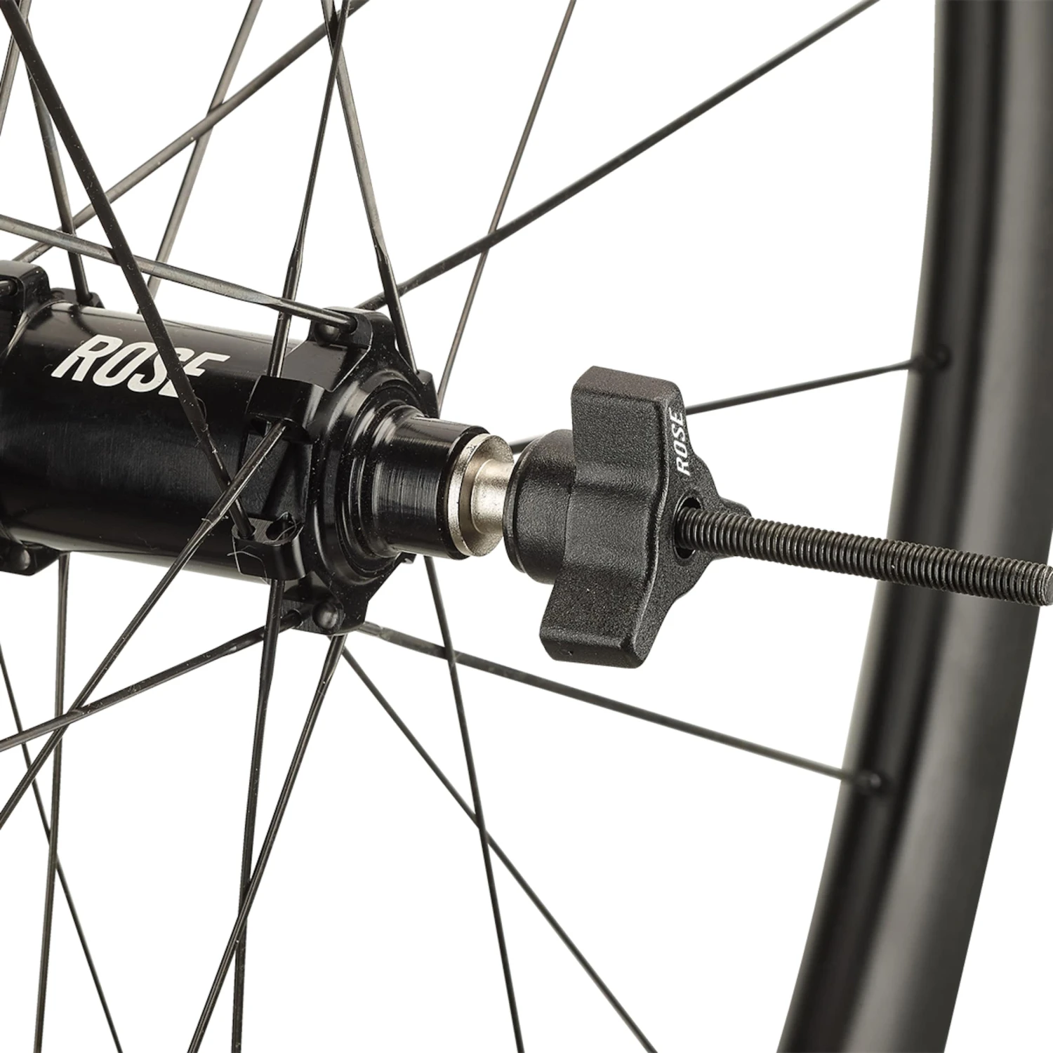 L’adaptateur d’axe creux variable de ROSE rajoute à la liste de fonctionnalités de blocages rapides celle de moyeux à axes creux. Les adaptateurs coniques correspondants du tendeur de moyeu permettent de parfaitement préparer en quelques instants les roues à axes traversants de 9 à 20 mm pour les tâches d’alignement et de centrage. Pour cela, on passe l’adaptateur d’axe creux ROSE à travers le moyeu et, en fonction du diamètre de l’axe, on l’attache en vissant aux fixations des deux côtés du pied de dévoilage. C’est rapide, précis et sûr pour avoir une roue parfaitement centrée.