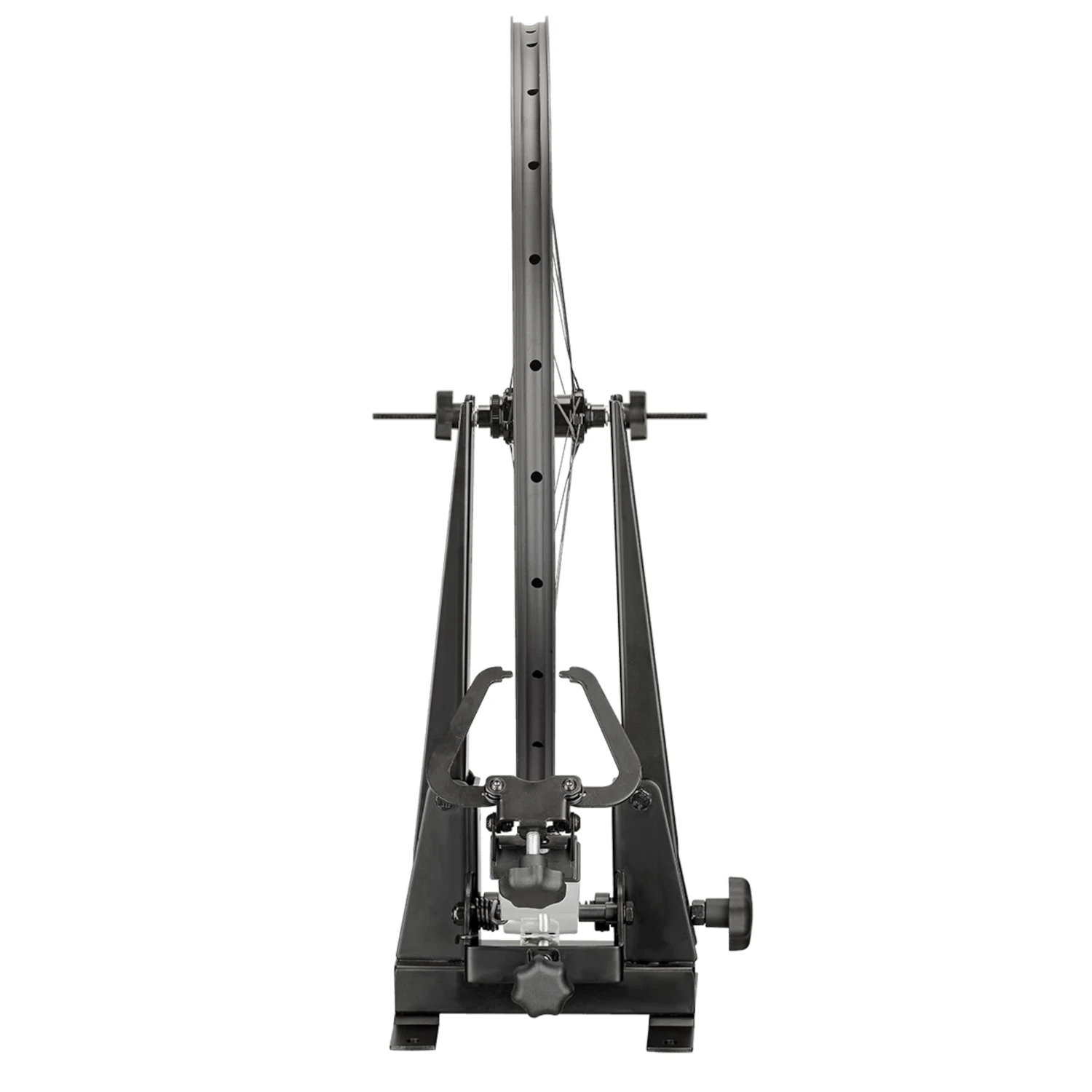 Avec cet ensemble pour le centrage, vous pouvez recentrer toutes les roues courantes. Sa construction solide laisse entrevoir que le 2-Zent.A:-XL est conçu pour l’usage fréquent. Vu son poids élevé, le support est stable et sûr sur votre atelier. Alternativement, vous pouvez l’attacher avec des vis à l’établi. Il y a des molettes ergonomiques pour serrer le moyeu, ajuster les bras de centrage et les flèches.