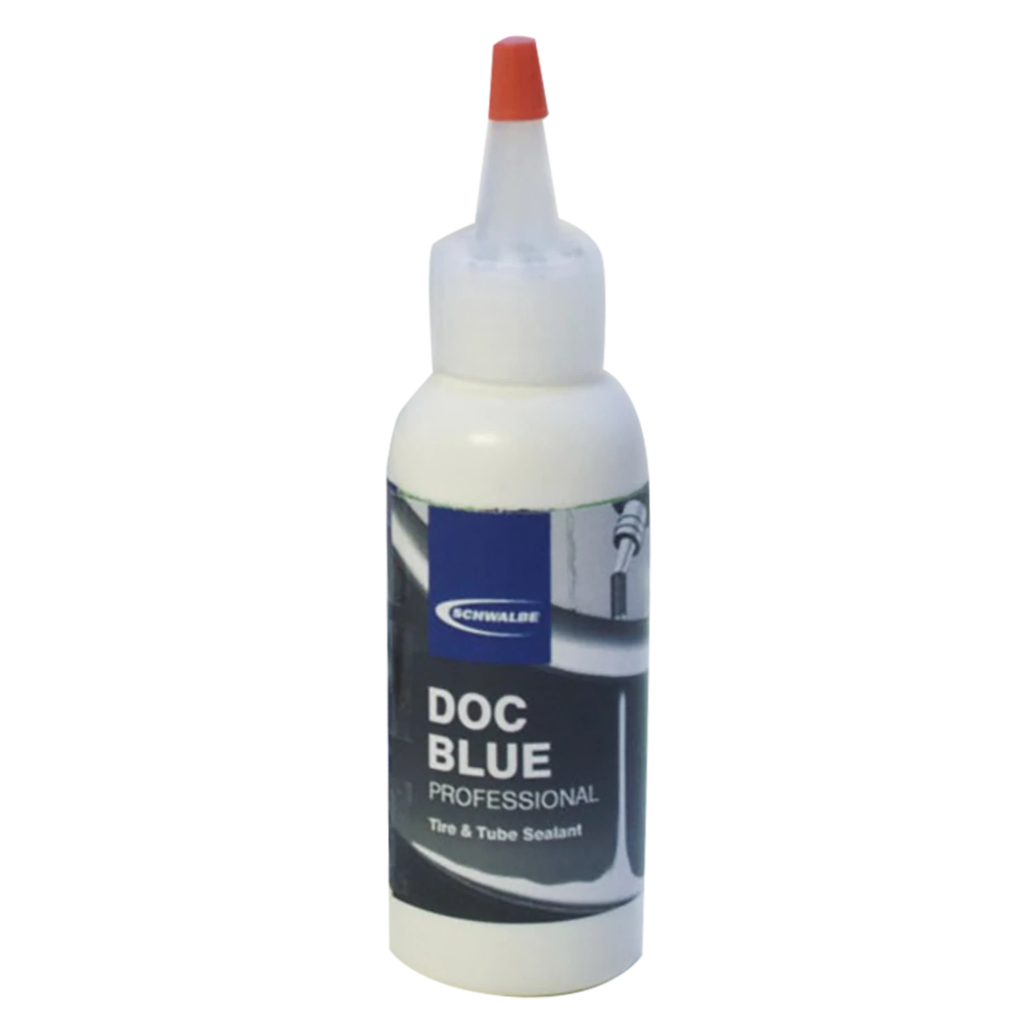 Le liquide préventif Schwalbe Doc Blue avec additif au latex étanche les systèmes tubeless et peut être utilisé au préalable comme moyen de dépannage dans des roues sans chambre à air.