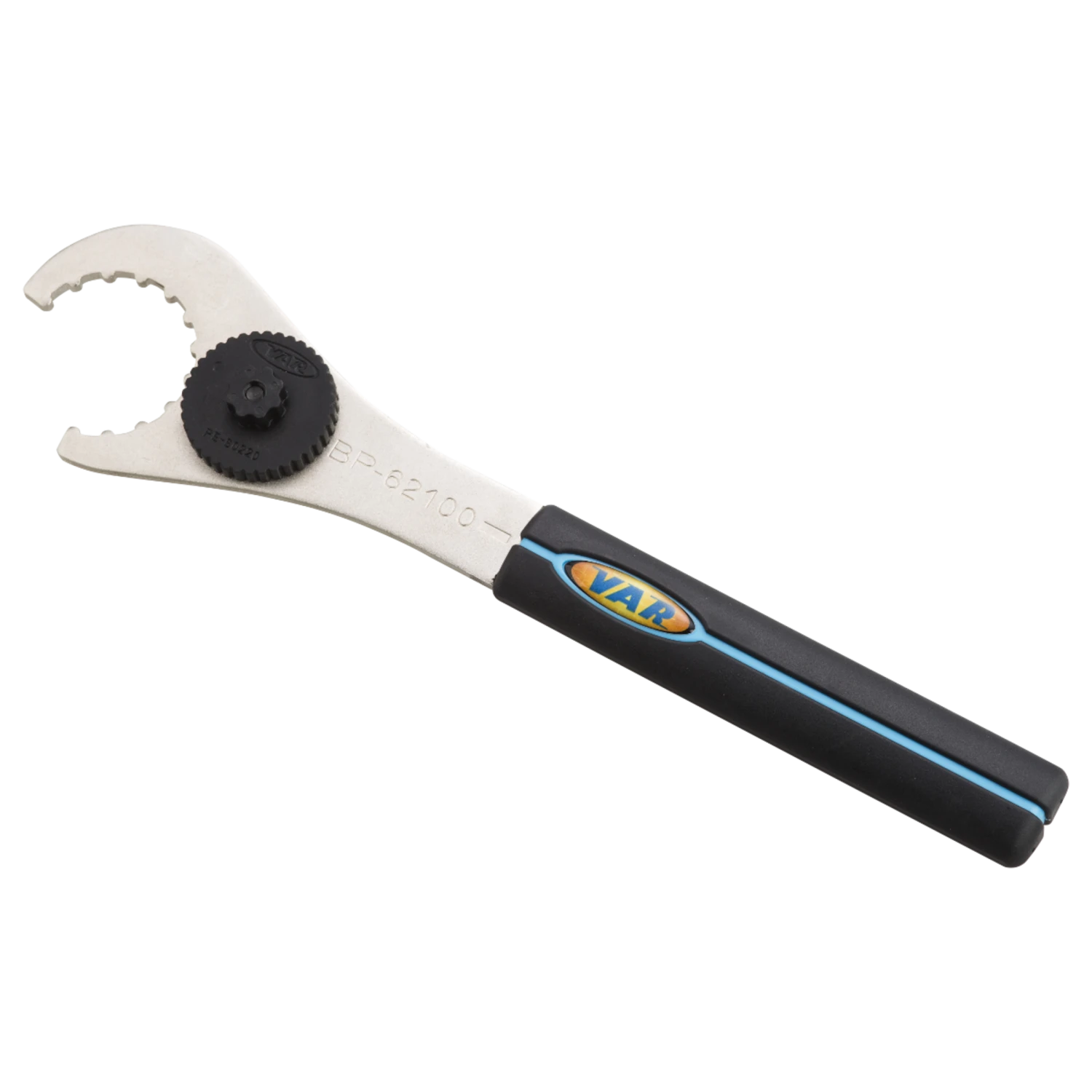La clé pour cuvettes BP-62100-C de VAR a un bras de levier énorme avec lequel on monte et démonte facilement les cuvettes, boîtiers de pédalier et pédaliers. Avec cet outil de qualité supérieure pour boîtiers, vous desserrez même des cuvettes bloqués. La poignée caoutchoutée permet l’utilisation facile car elle tient bien en main et transfère parfaitement la force. En plus, il y a un outil pour manivelle intégré avec lequel enlever en un rien les vis de l’étoile.